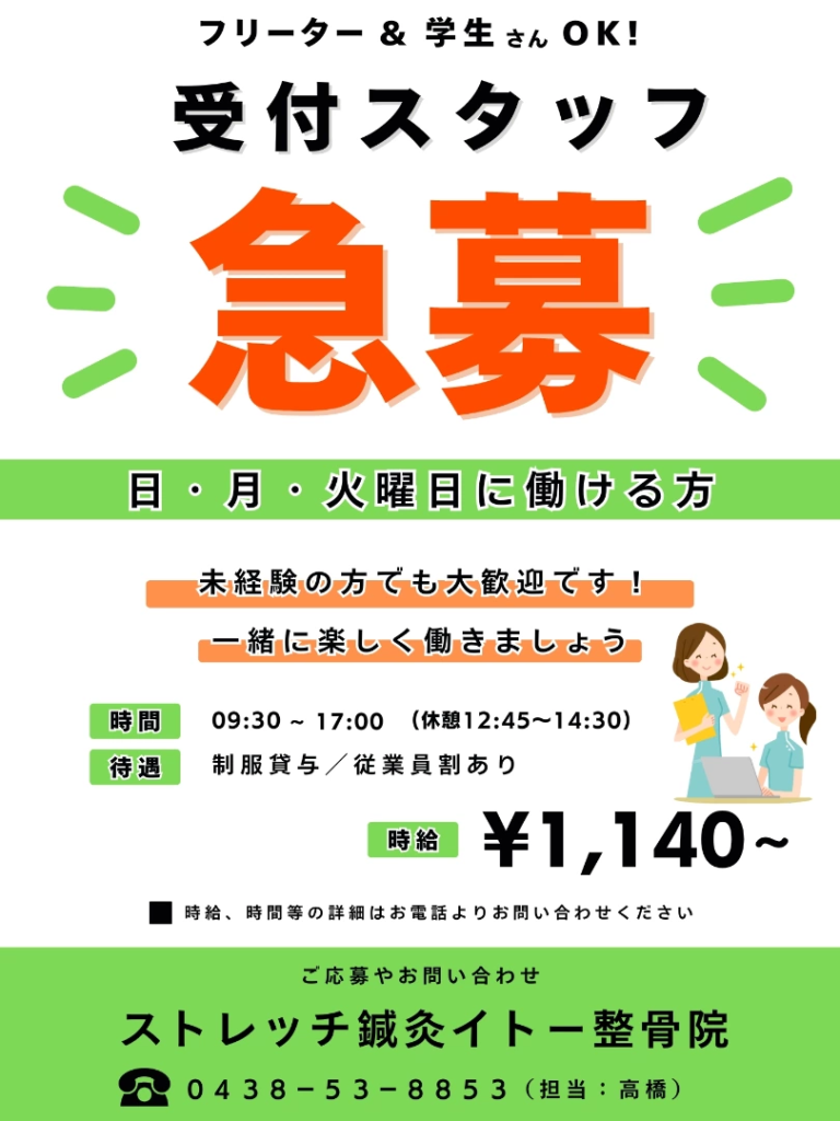 【ストレッチ鍼灸イトー整骨院】受付スタッフ募集のお知らせ