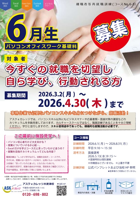 当校では現在【2026年6月開講 パソコンオフィスワーク基礎科】の訓練生募集がスタートしております!