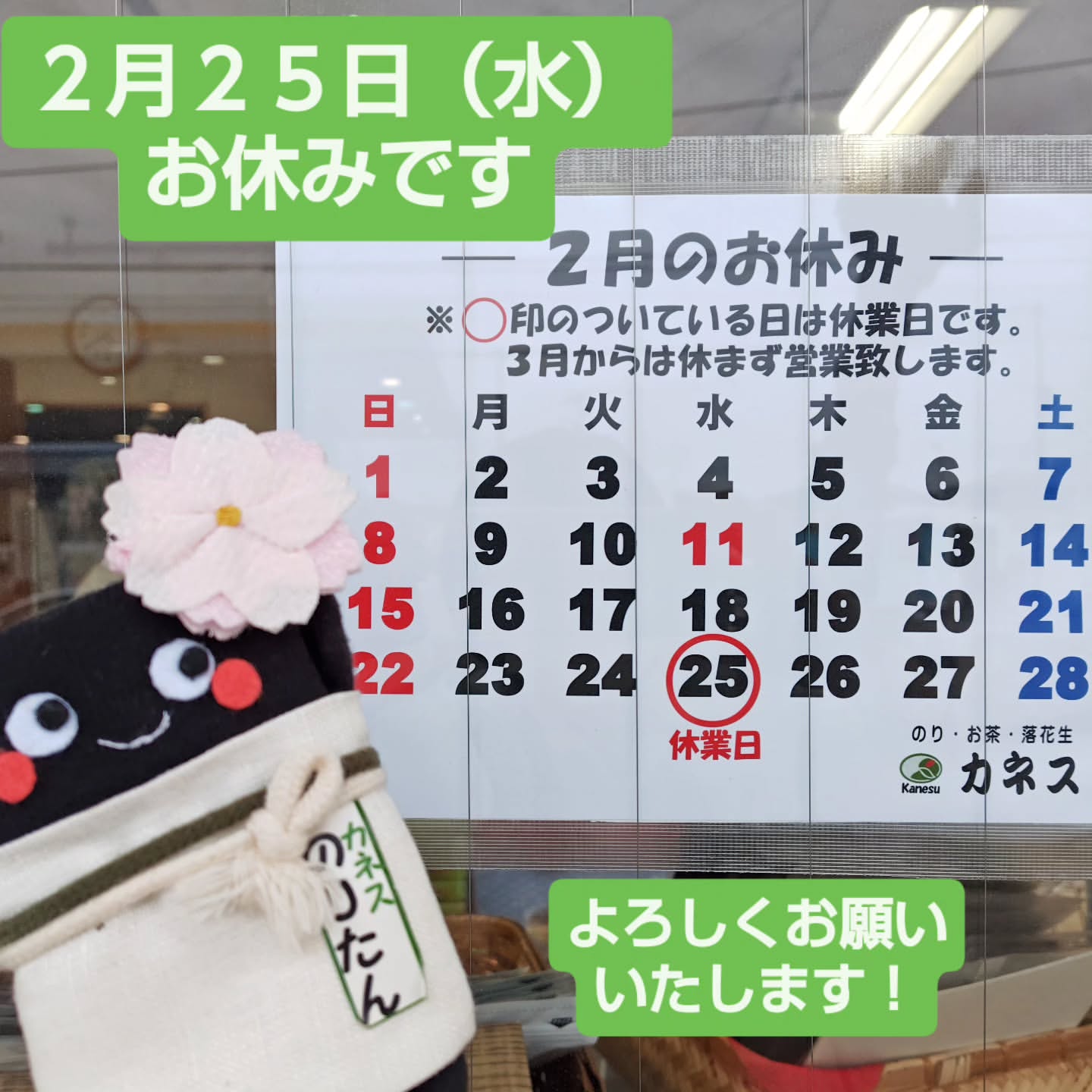 2026年2月25日(水)は臨時休業となります。