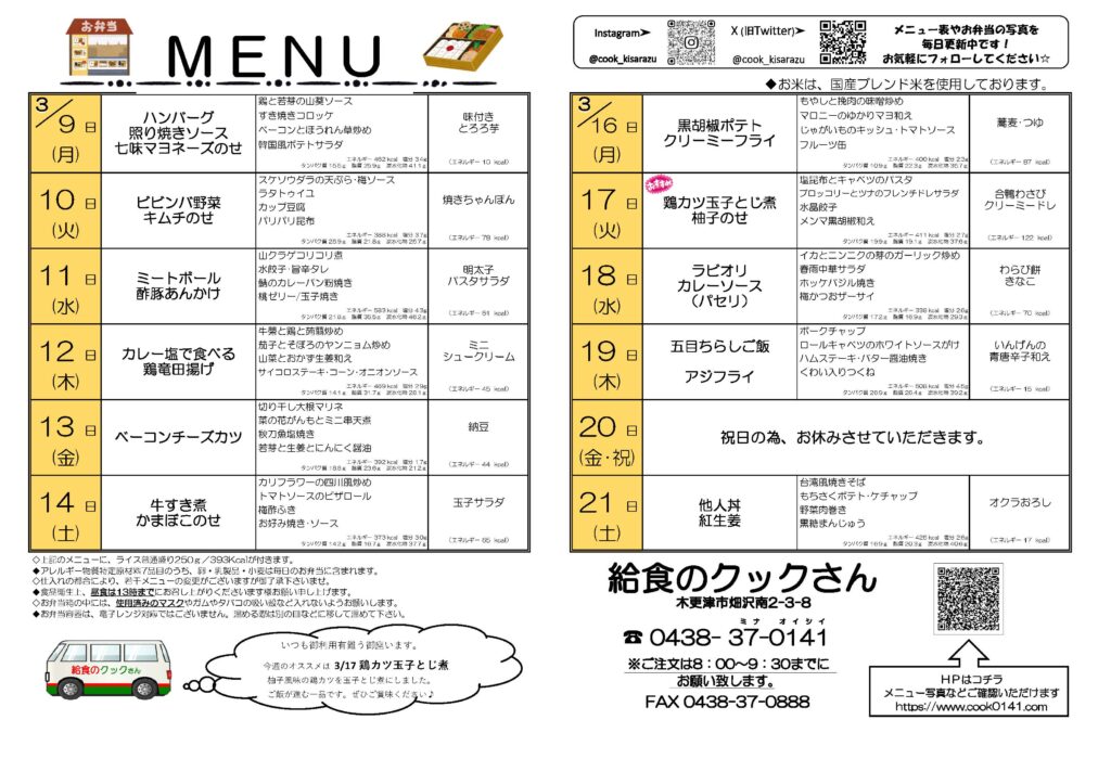 3/9(月)~3/21(土)までのお弁当メニュー!
