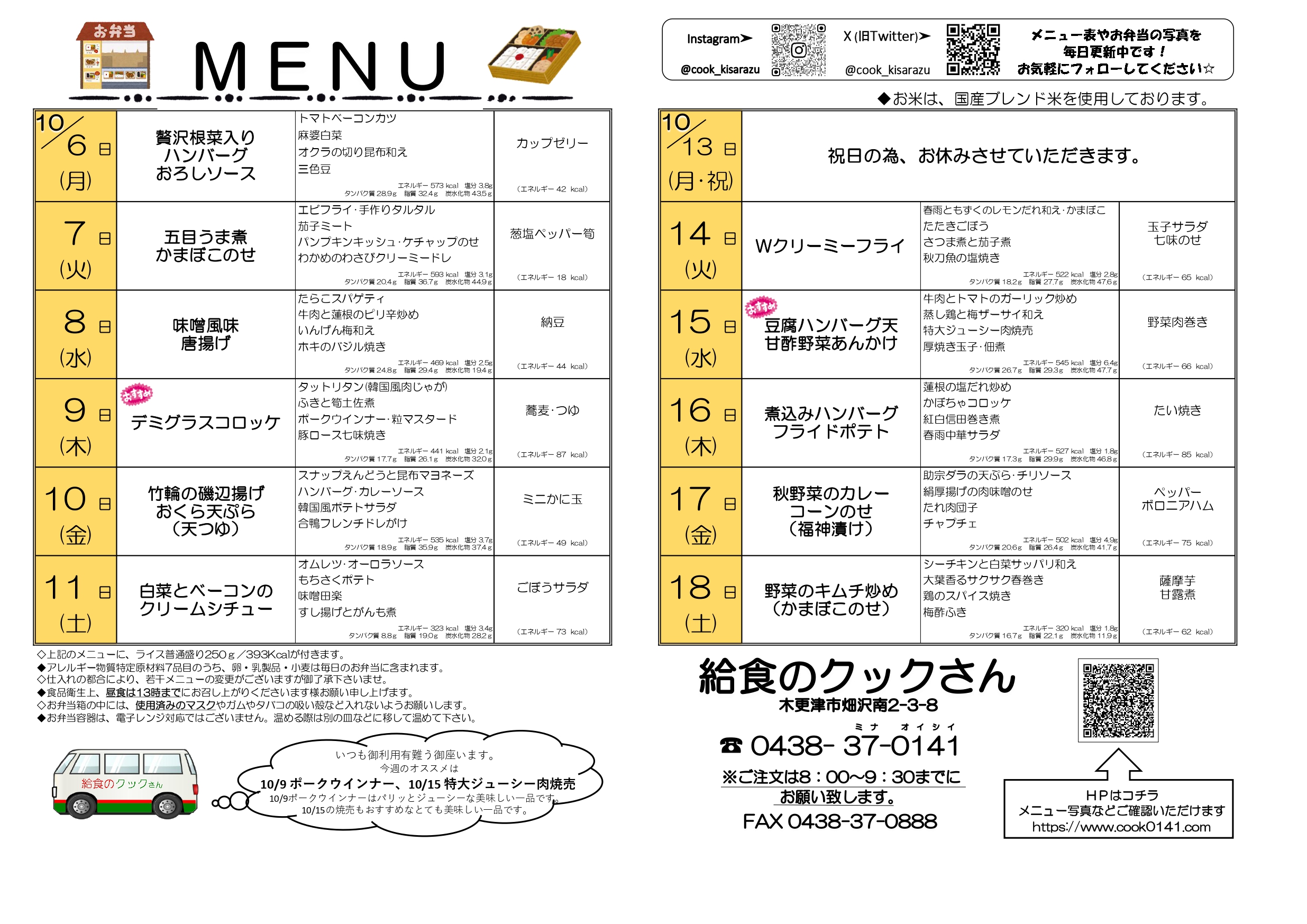 10/6(月)~10/18(土)までのお弁当メニュー!