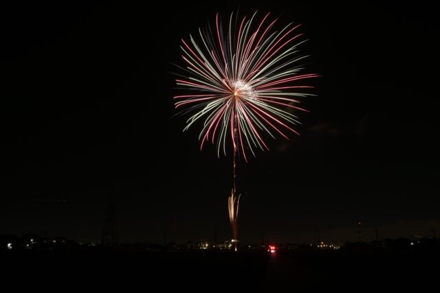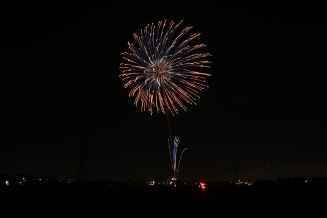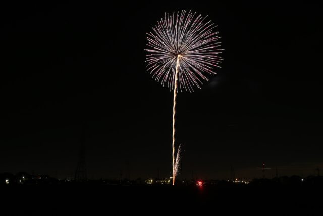 打ち揚がる花火は、最大が2.5号玉(直径約7.5㎝)で約80m打ち揚がり、花火が約50m開