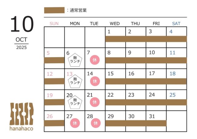 遅くなりましたが、10月の営業日をお知らせします。