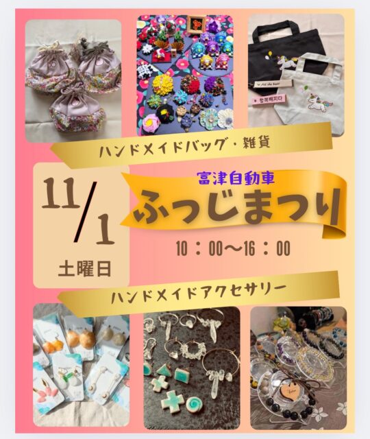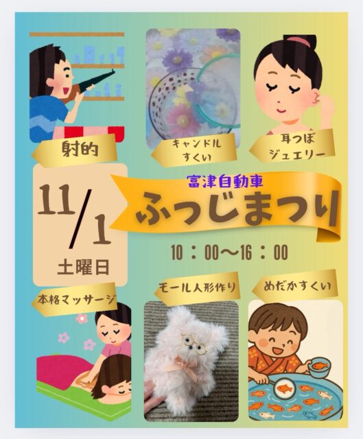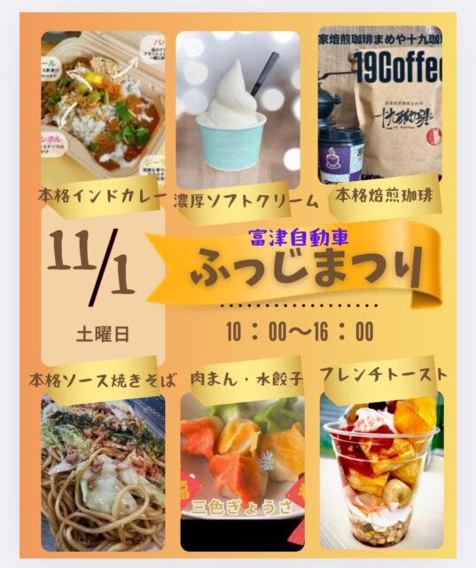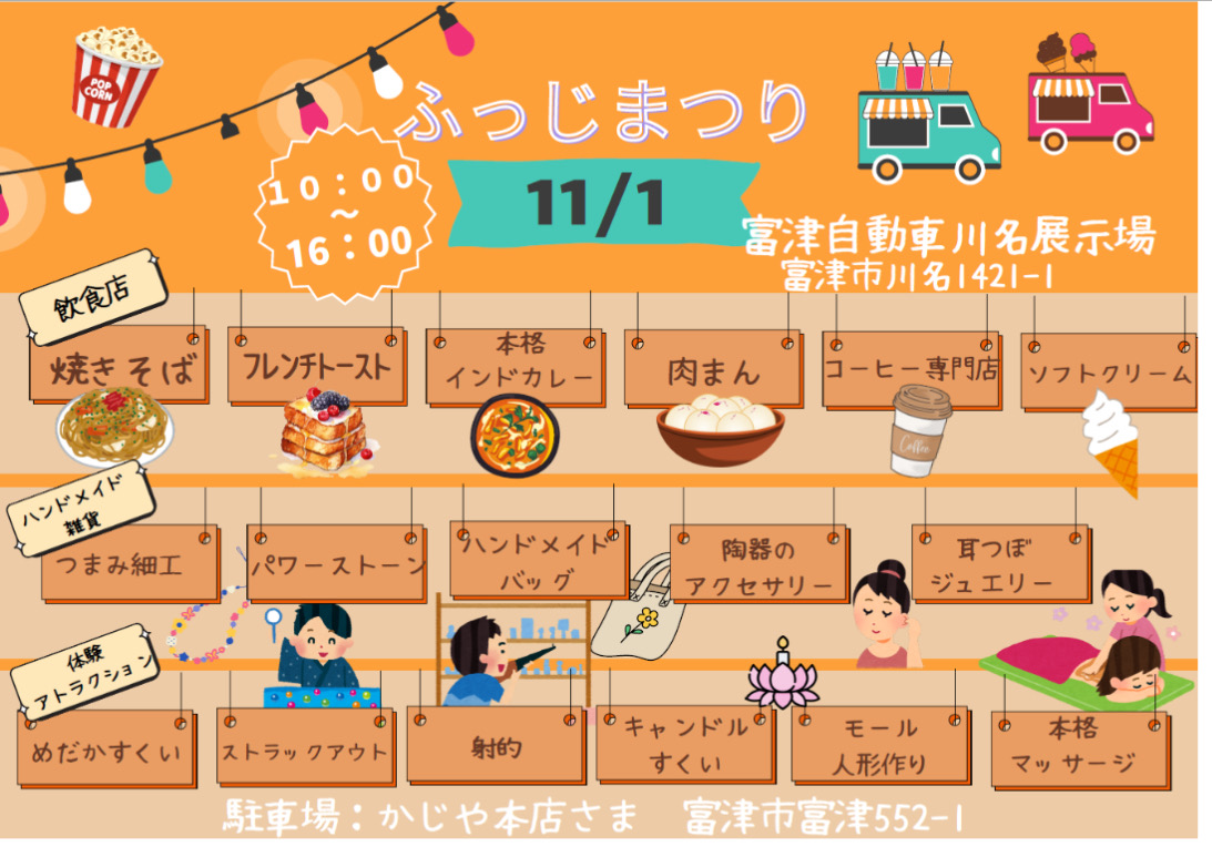 秋のイベントとして「ふっじまつり」を開催します。場所は、(株)富津自動車整備工場 川名展示場になります。