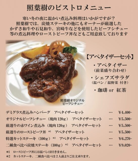また、照葉樹では炭焼きステーキだけでなく、暖かい煮込み料理もご用意してございます!!