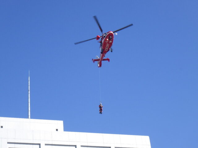 千葉市消防局のご協力のもと、市役所屋上の救助者をヘリコプターから救助する訓練は圧巻でもあり、