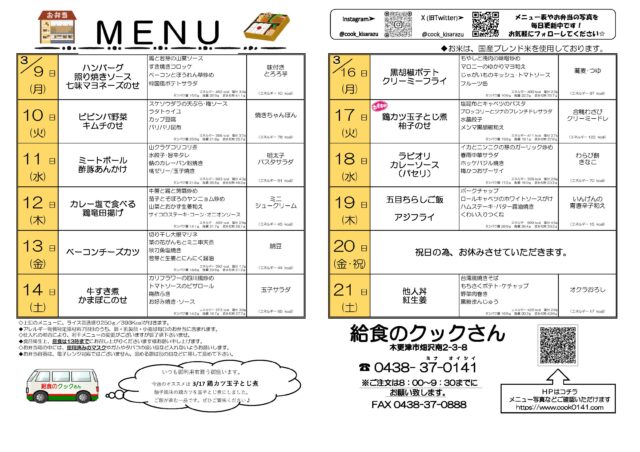 トレナビTOP >> 千葉県 >> 木更津市 >> クックアンドコマチ >> 3/9(月)~3/21(土)までのお弁当メニュー!