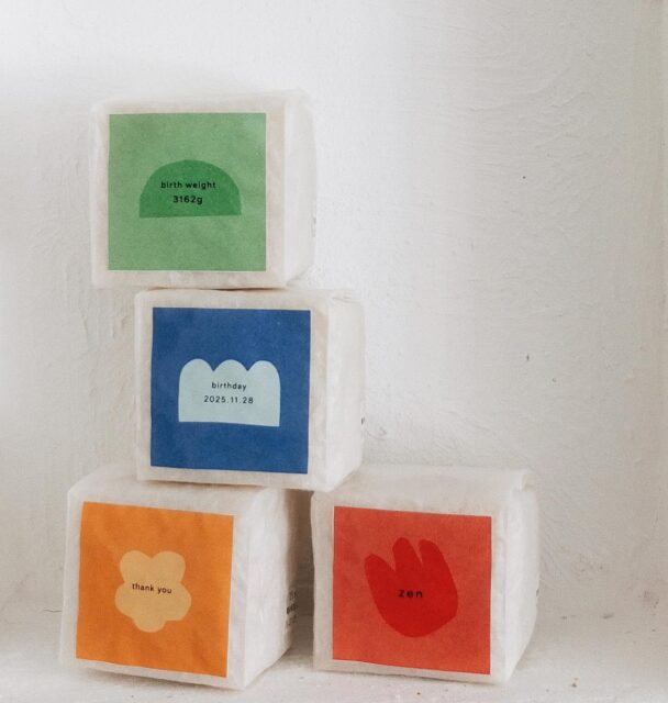 キューブ型のお米にステッカーを貼って内祝いとしてお贈りしました♪