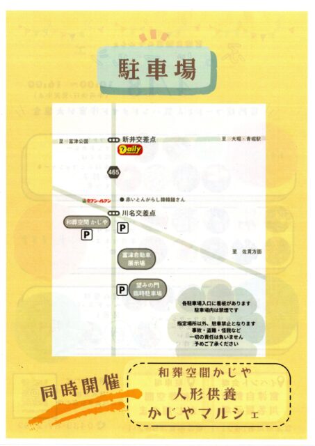 駐車場は「和葬空間かじ屋」さんの駐車場、望みの門臨時駐車場をご利用ください。