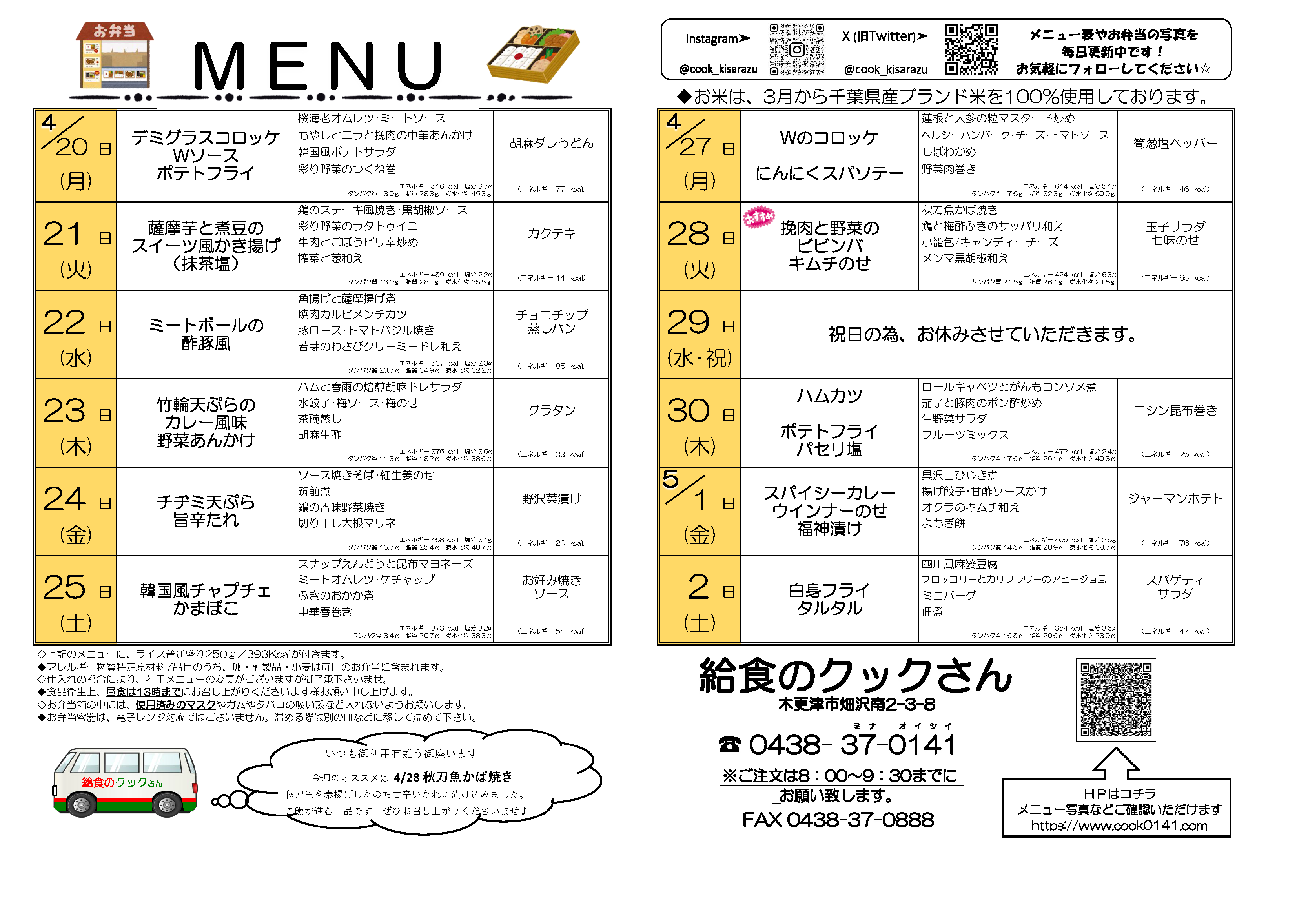 トレナビTOP >> 千葉県 >> 木更津市 >> クックアンドコマチ >> 4/20(月)~5/2(土)までのお弁当メニュー!