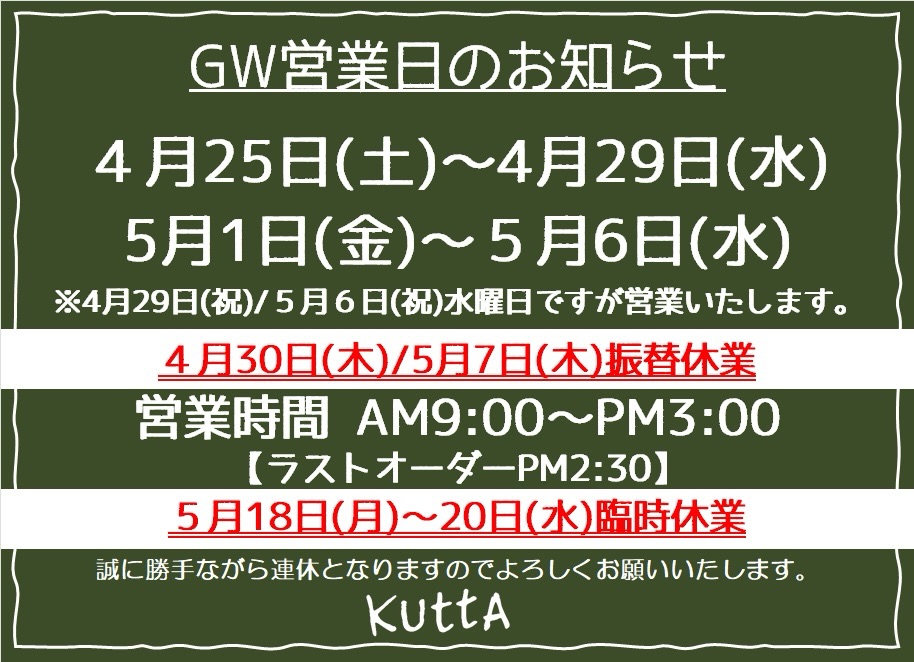 ゴールデンウィークの営業のお知らせです!