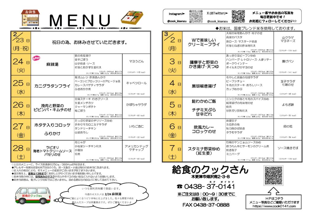 2/23(月・祝)~3/7(土)までのお弁当メニュー!