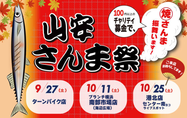 第1弾は9月27日(土)の「山安ターンパイク店」。北海道から届いた新鮮なサンマ2,000尾を用意し、来場者に炭火焼きで提供します。続く10月11日(土)は横浜南部市場店、10月25日(土)は港北店で開催。それぞれ2,000尾ずつが登場します。