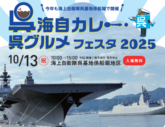 呉市の人気ご当地グルメ「呉海自カレー」を一度に味わえる「呉海自カレー・呉グルメフェスタ2025」が、10月13日(月・祝)に海上自衛隊呉基地係船堀地区で開催されます。
