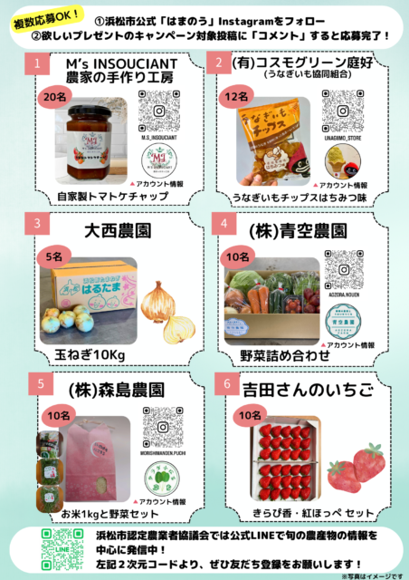 浜松市が運営するインスタグラムアカウント「はまのう」と、浜松市認定農業者協議会中央支部が共同で、地元農産物や加工品が当たるキャンペーンを実施中です。抽選で約70名に、トマトケチャップや玉ねぎ、野菜詰め合わせ、いちごセットなど、多彩な“浜松の美味しいもの”が当たります。
