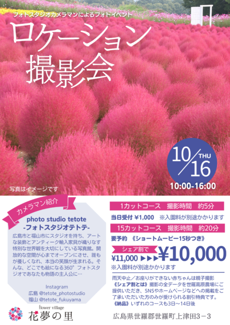 さらに10月16日(木)には、初の「ロケーション撮影会」も開催。フォトスタジオカメラマンがコキア畑で印象的な一枚を撮影します。1カットコースは当日受付、15カットコースは事前予約制です。