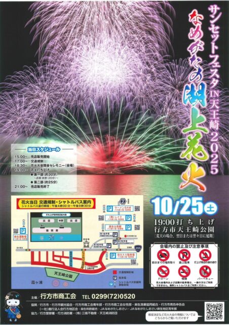 秋の夜空を鮮やかに染める「行方湖上花火大会」が、今年も天王崎公園(行方市麻生)で開催されます。