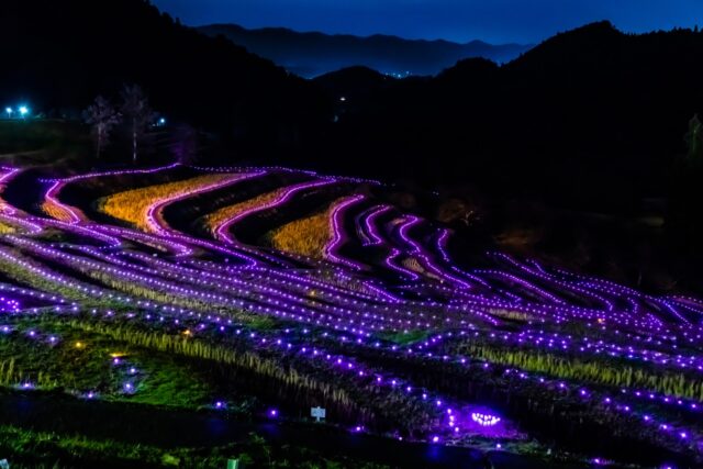 棚田を縁取る約一万本のLEDライトは、ブルーやオレンジ、グリーンなどにゆっくりと色を変え、波のように揺らめきながら田の稜線を描き出します。自然の闇と光の対比が織りなすその風景は、訪れる人々をやさしく包み込むよう。喧騒を離れた静かな時間の中で、日本の原風景と光が織りなすひとときを感じてみてはいかがでしょうか。