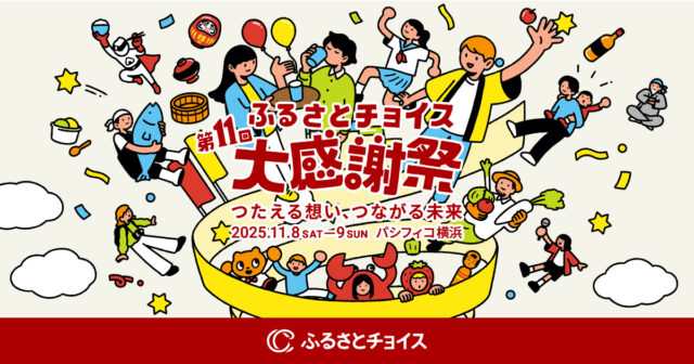全国各地の自治体や事業者が集う、日本最大級のふるさと納税イベント「第11回ふるさとチョイス大感謝祭」が、2025年11月8日(土)・9日(日)の2日間、横浜市・パシフィコ横浜で開催されます。