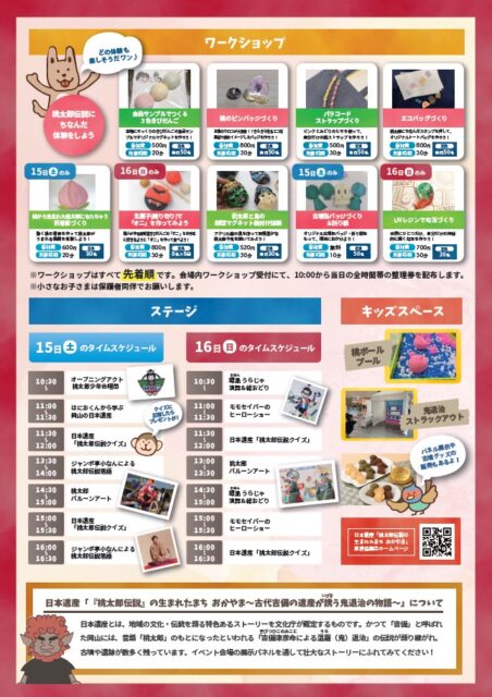 会場となるイオンモール岡山・未来スクエアでは、桃のピンバッジづくりや、桃太郎と鬼の顔型マグネット絵付けなどのワークショップをはじめ、桃太郎伝説クイズやステージイベントなど、子どもから大人まで楽しめるコンテンツが盛りだくさん。