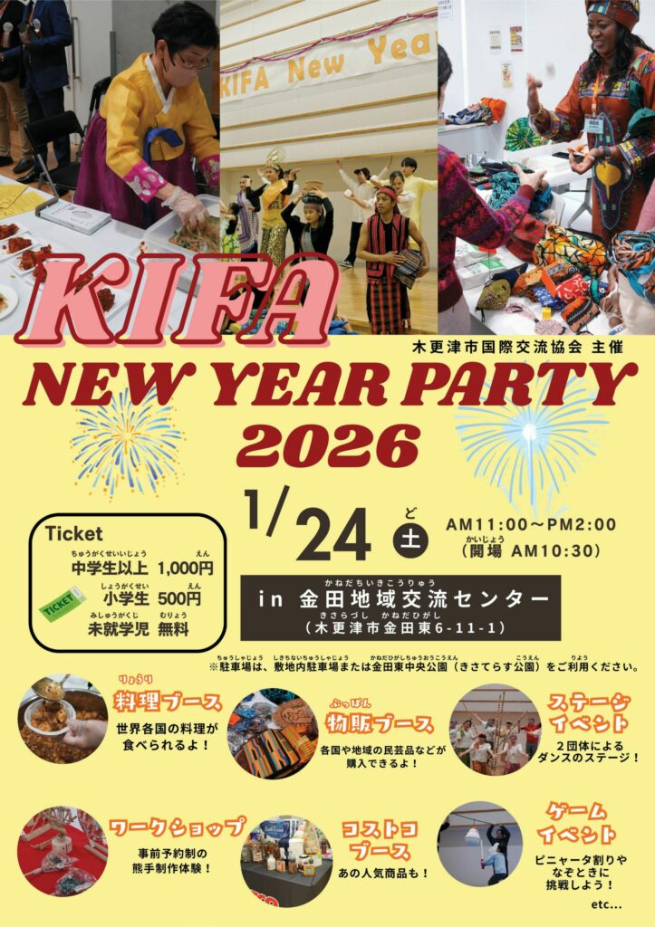 木更津市国際交流協会(KIFA)が主催する新春恒例イベント「KIFA NEW YEAR PARTY 2026」が、2026年1月24日(土)に金田地域交流センターで開催されます。