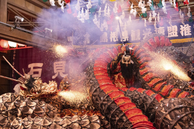 島根県西部・石見地域では、日本神話を題材にした伝統芸能「石見神楽」が古くから受け継がれ、今も地域に根差した文化として息づいています。舞手が豪華な衣装に身を包み、神話の世界を勢いよく表現する舞は迫力があり、特に大蛇が火や煙を吐きながら登場する場面は、観客を一気に物語へと引き込みます。