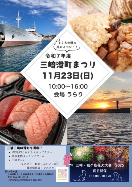 三浦・三崎港の名物イベント「三崎港町まつり」が、今年も三浦・みさき海の駅うらりで開催されます。新鮮な魚介や海産物、三崎まぐろの加工品など、港町ならではの地場産品が並ぶ即売会をはじめ、多彩な飲食コーナーがそろう人気の催しです。