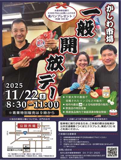 柏市公設市場で、年に一度の一般開放デーが行われます。水産仲卸によるマグロをはじめとした新鮮な魚介類の販売に加え、今回は青果物特別販売ブースが登場。千葉大学の農園で採れたリンゴやはちみつ、柏市産のネギ・キャベツ・チンゲン菜など、地元で育った旬の農産物が並びます。