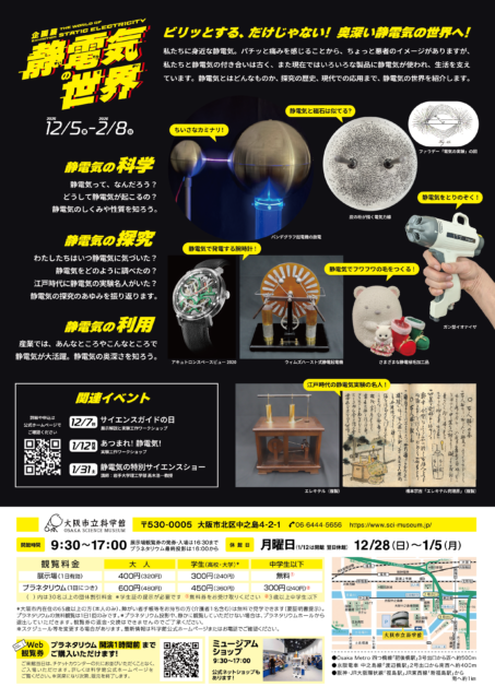 大阪市立科学館では、私たちの生活に欠かせない「静電気」の仕組みや活用を学べる企画展「静電気の世界」を、2025年12月5日(金)から2026年2月8日(日)まで開催します。