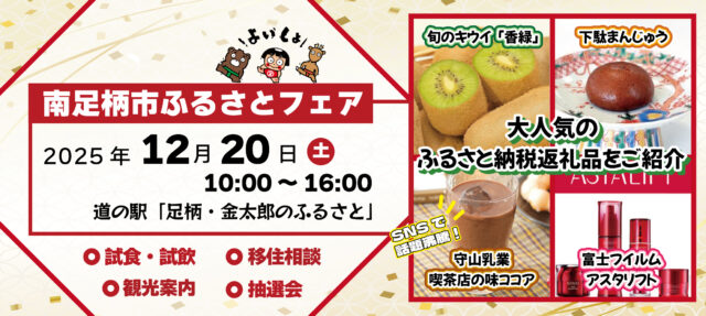 道の駅「足柄・金太郎のふるさと」で、南足柄市の魅力を紹介する「南足柄市ふるさとフェア」が開催されます。会場では、ふるさと納税の返礼品として登録されている旬の果物や菓子の試食、化粧品のお試し、人気返礼品の展示などが行われます。希望者はその場で寄附も可能で、寄附者には返礼品の受け渡しにも対応しています。