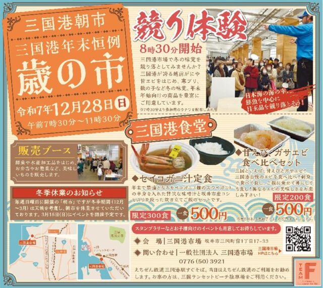 越前がにの水揚げ港として知られる福井県坂井市・三国港市場では、年末恒例の「歳の市」が12月28日に開催されます。