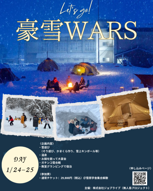 新潟県十日町市の廃校グランピング施設「雪原学舎」を舞台に、雪上スポーツイベント「豪雪WARS 2026」が2026年1月24日(土)・25日(日)の1泊2日で開催されます。