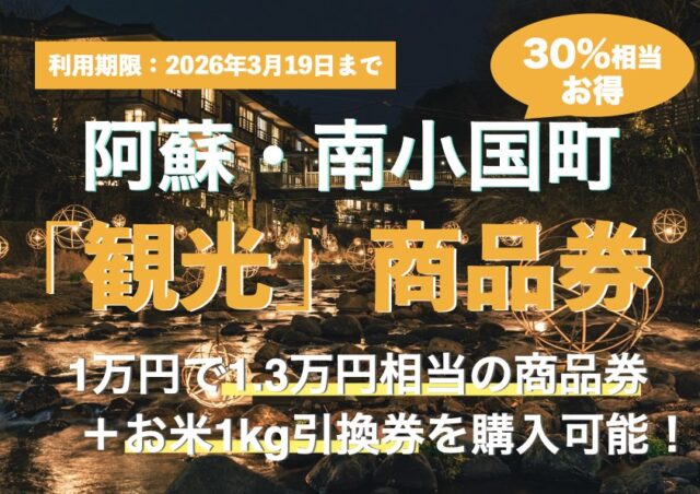 黒川温泉をはじめ、阿蘇の自然と温泉文化が息づく南小国町で、冬の旅を後押しする「南小国町観光商品券」の販売が始まります。1万円で1万3千円分使えるプレミアム付きに加え、南小国町産のお米1kgが付くうれしい特典付き。温泉街の散策や宿泊、地元グルメ、お土産選びまで、幅広く活用できます。
