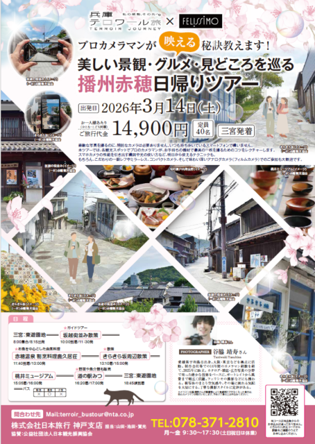 昼食には、瀬戸内の海の幸を中心とした会席料理を味わい、旅の締めくくりには道の駅みつでの買い物も楽しめます。写真初心者からカメラ好きまで、播州赤穂の魅力を五感で味わえる一日になりそうです。