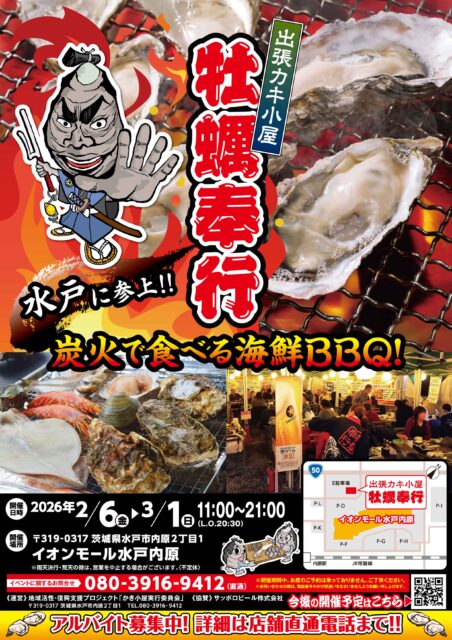 イオンモール水戸内原の駐車場に、期間限定で出張カキ小屋「牡蠣奉行」がやってきます。