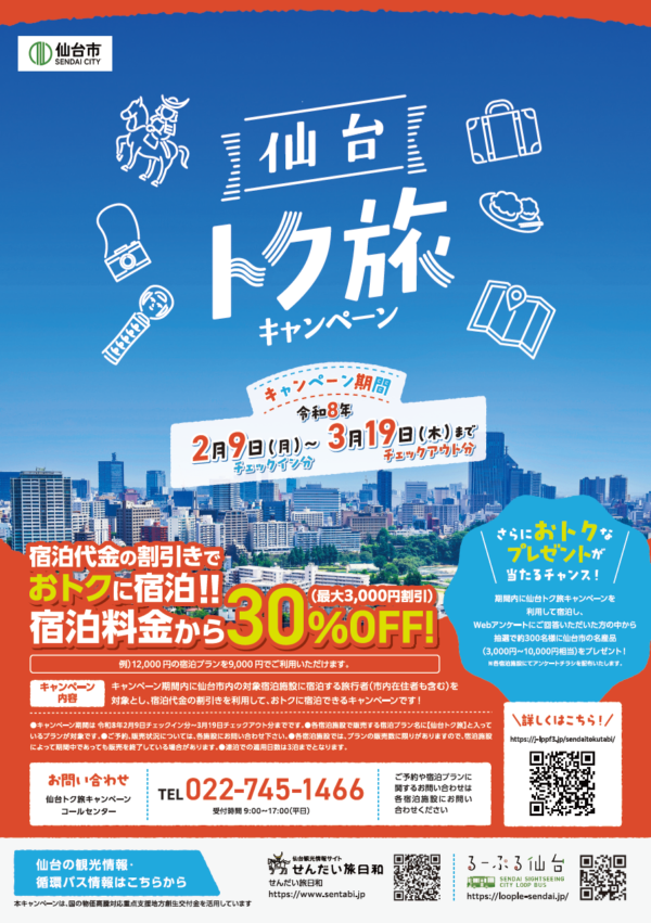 冬の仙台観光をお得に楽しめる「仙台市トク旅キャンペーン<第2期>」がスタートします。期間中は、市内の対象宿泊施設で、宿泊代金が最大30%割引になるプランが利用できます。