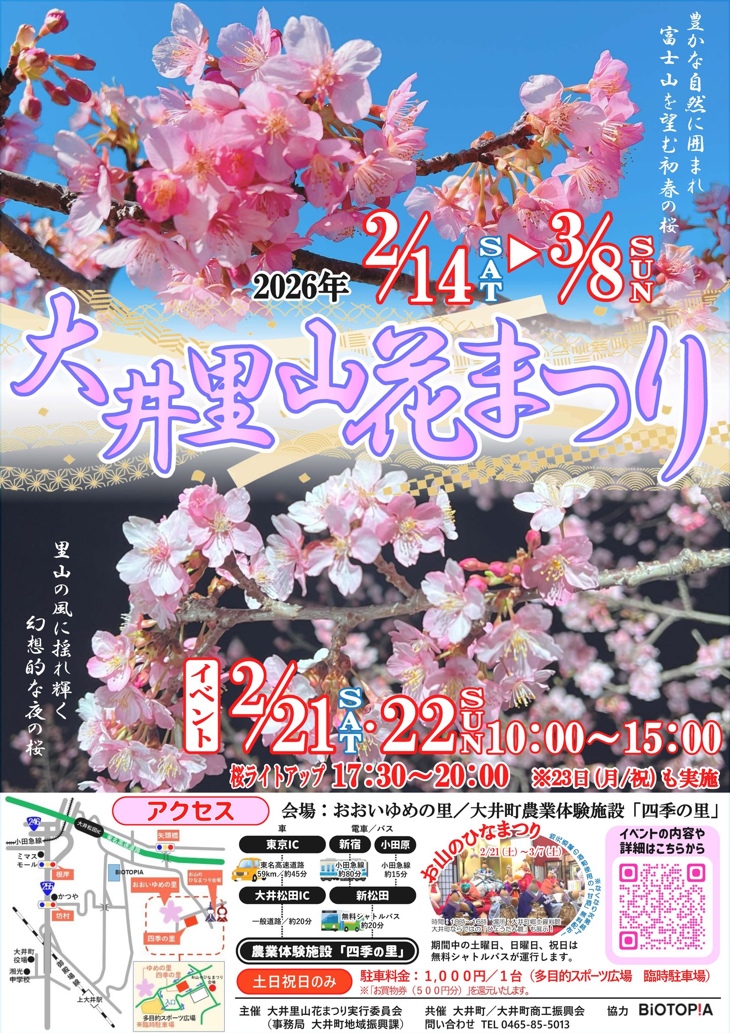 神奈川県大井町のおおいゆめの里で、2月14日から3月8日まで「大井里山花まつり」が開催されます。足柄平野と富士山を望む里山に約170本の早咲き桜が咲き誇り、ひと足早い春の景色が広がります。会場となる四季の里では、ピザ作りなどの体験やステージイベント、模擬店も登場。2月21日・22日を中心ににぎわいを見せます。夜には桜のライトアップとひょうたんランプの灯りが里山を幻想的に彩り、昼とは異なる表情も楽しめます。自然と触れ合いながら、早春の一日を過ごしてみてはいかがでしょうか。