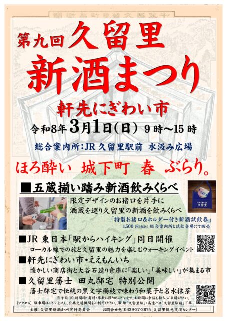 名水の里として知られる千葉県君津市久留里で、「第九回久留里新酒まつり 軒先にぎわい市」が開催されます。JR久留里駅前と商店街を舞台に、しぼりたての新酒を味わえる春恒例の催しです。限定デザインのお猪口と試飲券がセットになった企画では、この時期ならではの新酒の飲み比べを楽しめます。商店街の軒先には地元の味覚が並び、久留里城黒田藩士邸宅「田丸邸」の特別公開も実施。城下町の風情を感じながら、名水が育む酒文化に触れてみてはいかがでしょうか。