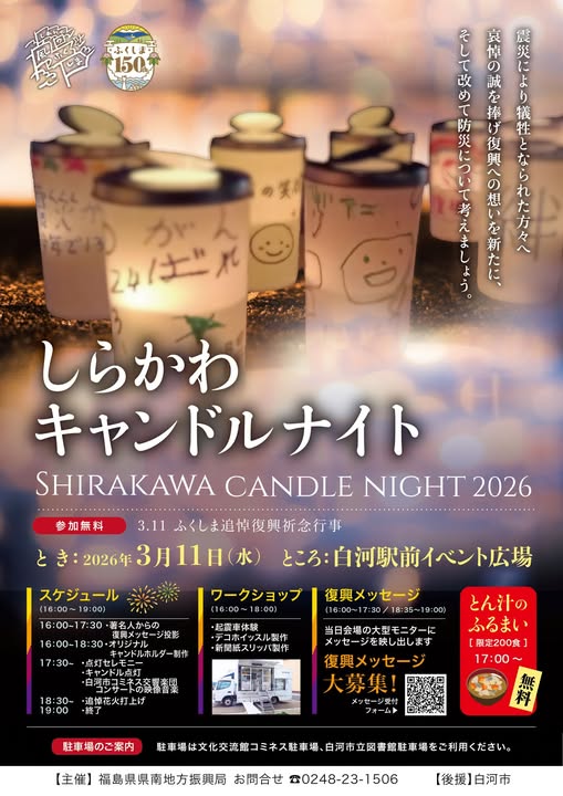 東日本大震災の犠牲者へ哀悼の誠を捧げ、復興への思いを新たにする「キャンドルナイト」が3月11日(水)、白河駅前イベント広場で開催されます。会場ではキャンドルのやわらかな灯りがともり、地域の子どもたちがデザインしたホルダーも展示。防災ワークショップや起震車体験、メッセージ動画の上映などを通して、記憶と教訓を次世代へつなぎます。夕刻の点灯セレモニー、そして追悼花火が夜空を彩るひとときは、静かな祈りと希望を感じる時間に。参加無料。心を寄せ合う時間を過ごしてみてはいかがでしょうか。