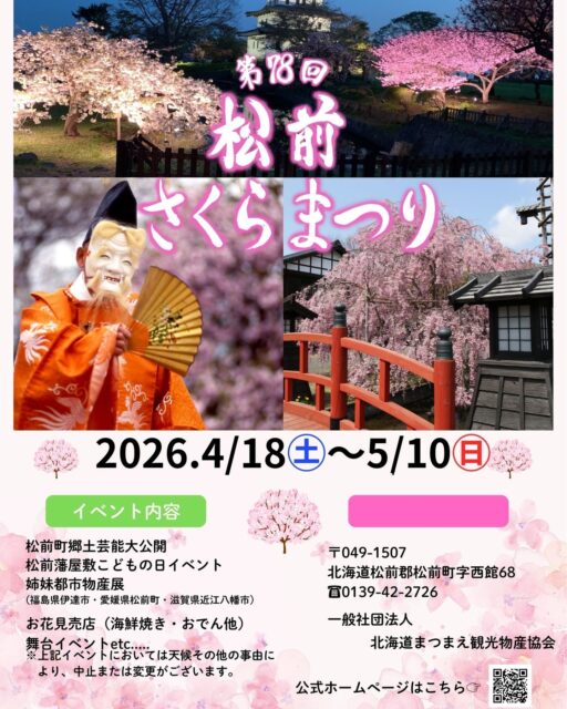 北海道屈指の桜の名所として知られる松前公園で、「第78回 松前さくらまつり」が2026年4月18日(土)から5月10日(日)まで開催されます。さくらの名所100選にも選ばれている同公園には、約250種類・1万本の桜が植えられており、早咲きから遅咲きまで順に開花するため、約1か月にわたり花見を楽しめるのが特徴です。園内では北海道唯一の日本式城郭である松前城を背景に桜が咲き誇り、歴史情緒あふれる景色が広がります。期間中は日没から21時まで桜のライトアップも行われ、幻想的な夜桜を満喫できるほか、スタンプラリーやステージイベント、露店の出店なども予定されており、昼夜を通して春の松前を楽しめます。