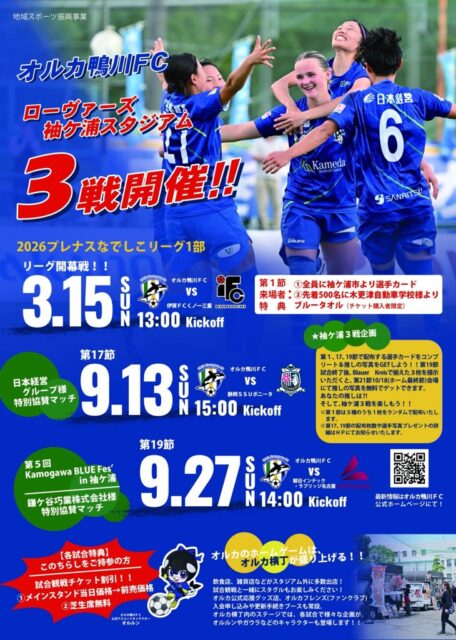 2026シーズンの開幕となる第1節は、シーズンの行方を占う注目の一戦。来場者には「袖ケ浦市×オルカ鴨川FC」のPRカードが配布される予定です。海と緑に囲まれた千葉の地で、躍動感あふれる女子サッカーの試合を観戦してみてはいかがでしょうか。
