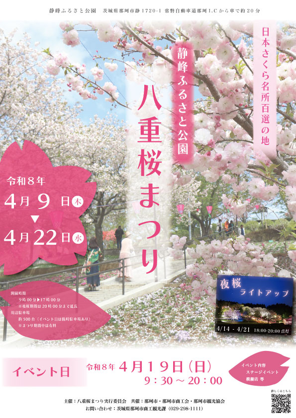約2,000本の八重桜が咲き誇る「八重桜まつり」が、静峰ふるさと公園で開催されます。「日本さくら名所100選」にも選ばれた園内は、広大な敷地いっぱいに華やかな桜が広がり、春ならではの壮観な景色を楽しめます。
