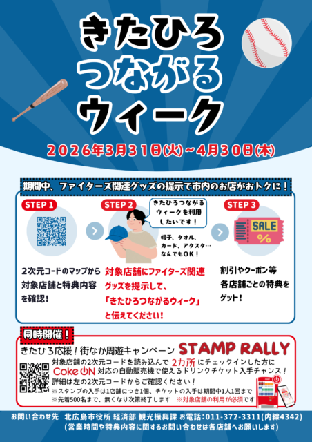 北海道北広島市で、街歩きをおトクに楽しめるキャンペーン「きたひろつながるウィーク」が開催されます。野球シーズンの開幕にあわせ、街全体が盛り上がる期間限定企画です。
