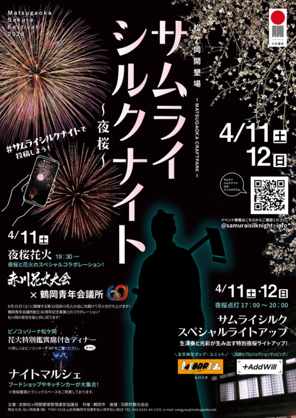 国指定史跡・松ヶ岡開墾場で、「サムライシルクナイト~夜桜~」が開催されます。樹齢100年を超える桜並木を舞台に、ライトアップとプロジェクションマッピング、生演奏が融合した幻想的な空間が広がります。明治期の庄内藩士による開拓の歴史を背景に、蚕室群と桜が織りなす風景は、ここならではの特別な魅力。さらに地元の食や花火演出も加わり、春の夜を五感で楽しめるひとときが演出されます。歴史と自然が調和する夜の景色を味わってみてはいかがでしょうか。