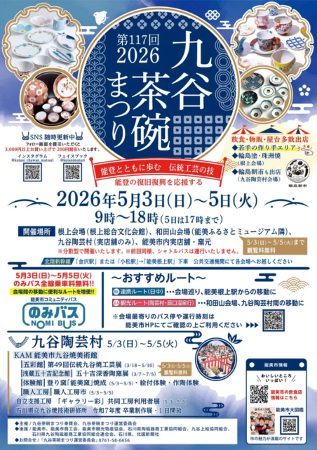 また、根上会場では輪島塗や珠洲焼の出店、若手作家のブースが登場。九谷陶芸村では輪島朝市も開催され、地域の文化や賑わいを感じられます。期間中は市内を巡るバスの無料運行や増便もあり、観光しながら効率よく楽しめます。
