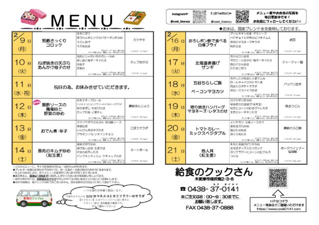 2/9(月)~2/21(土)までのお弁当メニュー!